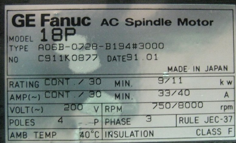 Fanuc AC Spindle Motor 18P, A06B-0728-B194 3000, drive CNC VMC HMC Mill, HP RPM