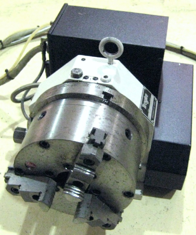 This 9" TROYKE Model DL-9-B CNC Rotary Table is servo driven w/pneumatic brake and w/8.25" 3-jaw chuck w/2.25" hole and a 6.375" center height, a tailstock w/6.375" center height, 6' cable & air hose, and manual.